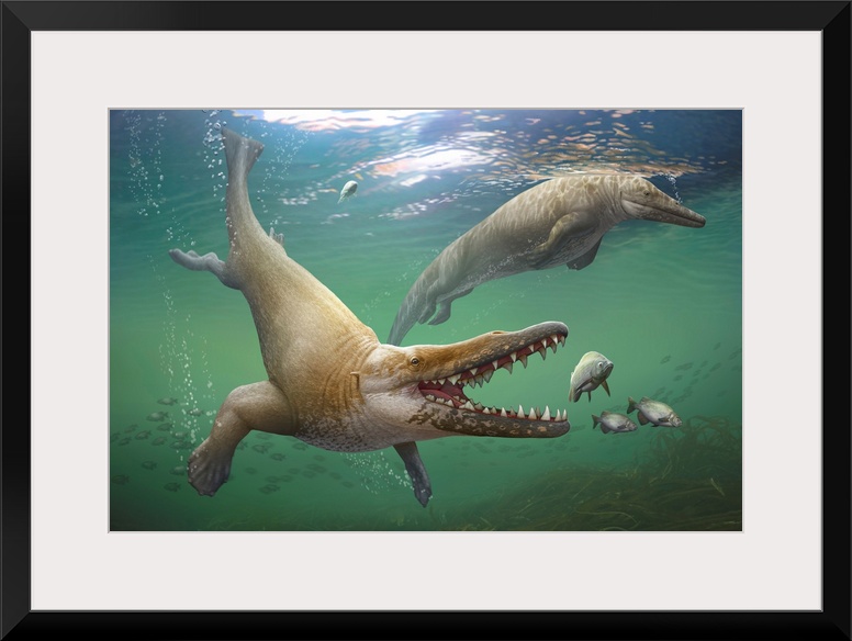 <p>A prehistoric whale, Georgiacetus vogtlensis, catching fish.</p>
