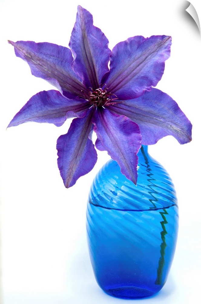 <p>A purple clematis flower in a blue vase.</p>