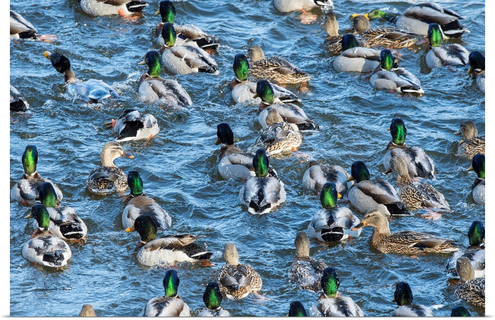 <p>Mallard Ducks (Anas platyrhynchos) enjoying a splashing good time in winter at Monticello, MN, USA.</p>
