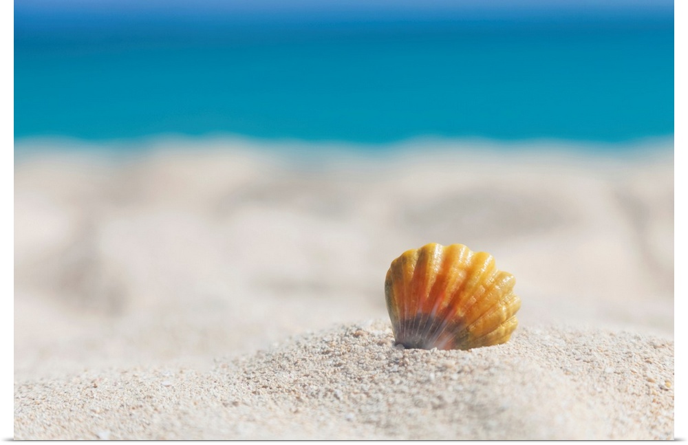<p>A rare rainbow color Hawaiian Sunrise Scallop Seashell, also known as Pecten Langfordi, in the sand at the beach at sunrise; Honolulu, Oahu Hawaii, United States of America</p>