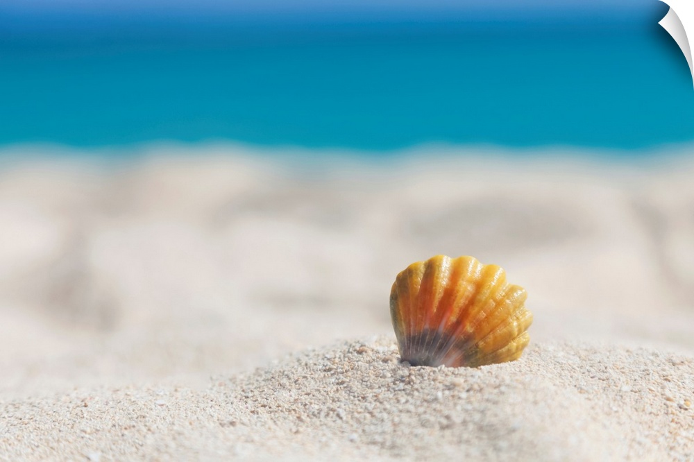 <p>A rare rainbow color Hawaiian Sunrise Scallop Seashell, also known as Pecten Langfordi, in the sand at the beach at sunrise; Honolulu, Oahu Hawaii, United States of America</p>