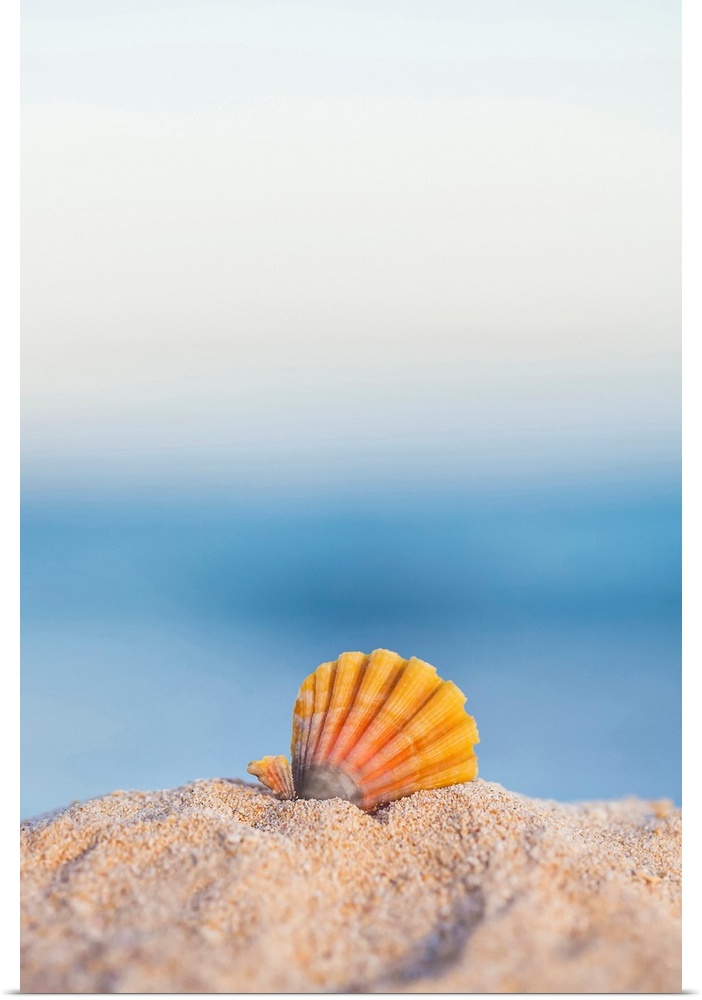 <p>A rare rainbow color Hawaiian Sunrise Scallop Seashell, also known as Pecten Langfordi, in the sand at the beach at sunrise; Honolulu, Oahu Hawaii, United States of America</p>