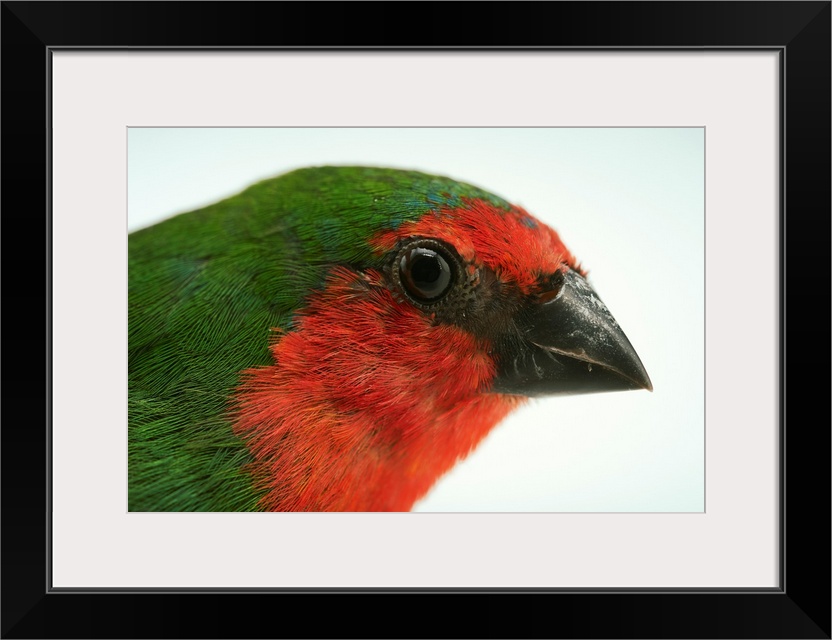 <p>A red faced parrot finch or red throated parrotfinch, Erythrura psittacea, at Sylvan Heights Waterfowl Park.</p>