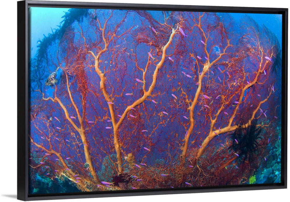 <p>A red sea fan with purple anthias fish, Papua New Guinea.</p>
