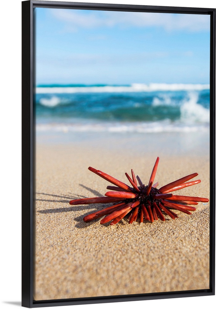 <p>A Red Slate Pencil Urchin (Heterocentrotus Mamillatus) sounds on the sand at the beach; Honolulu, Oahu, Hawaii, United States of America</p>