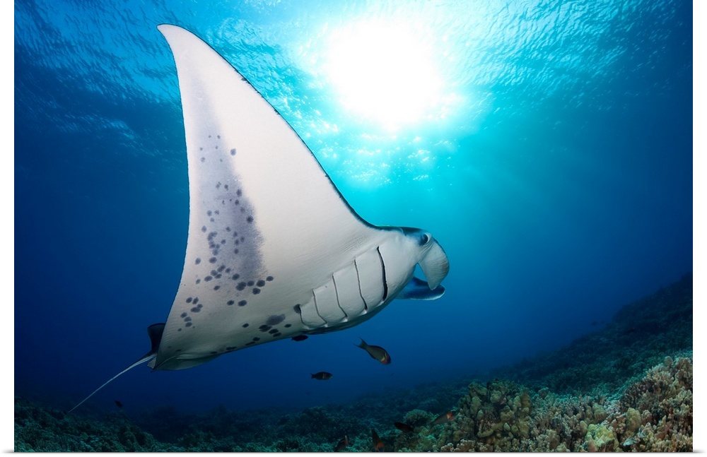 <p>A reef manta ray (Manta alfredi), cruises over hard coral off West Maui, Hawaii, United States of America.</p>