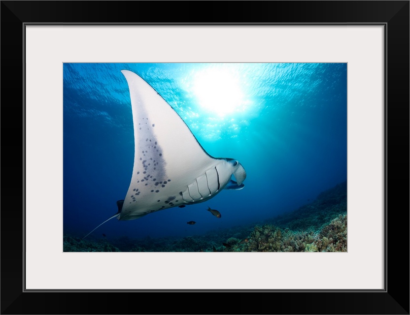 <p>A reef manta ray (Manta alfredi), cruises over hard coral off West Maui, Hawaii, United States of America.</p>