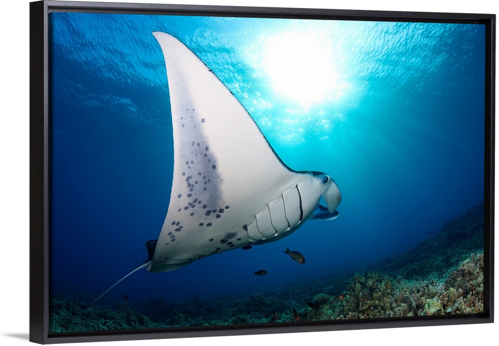 <p>A reef manta ray (Manta alfredi), cruises over hard coral off West Maui, Hawaii, United States of America.</p>
