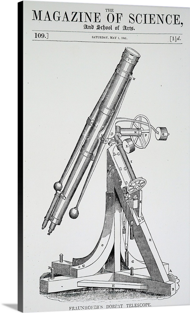 <p>Engraving depicting a refracting telescope built by Joseph von Fraunhofer, a German physicist. Dated 19th Century.</p>