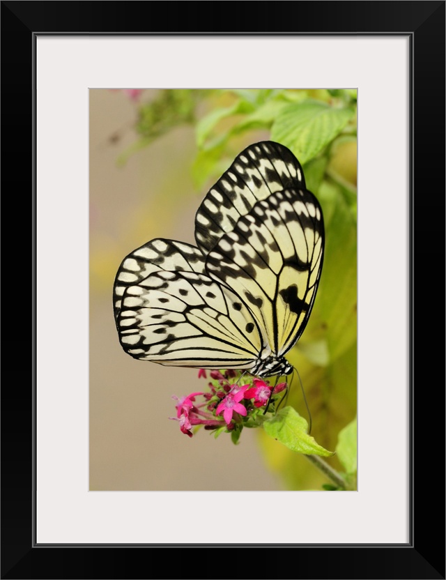 <p>A rice paper butterfly, Idea leuconoe, pollinating pink flowers. Westford, Massachusetts.</p>