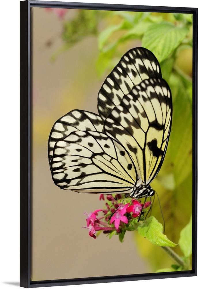 <p>A rice paper butterfly, Idea leuconoe, pollinating pink flowers. Westford, Massachusetts.</p>