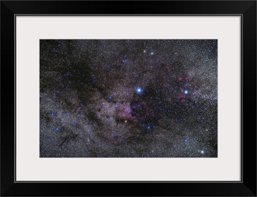 <p>The region of the summer Milky Way in northern Cygnus containing a rich collection of bright nebulas: the North America Nebula at centre and the Gamma Cygni complex at right, plus the dark nebulas Le Gentil 3, the Funnel Cloud Nebula at upper left, the Northern Coal Sack at centre, and the finger-like B168 at lower left. The bright star at centre is Deneb. M39 is at lower left.-</p>