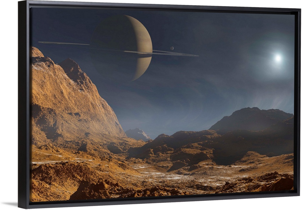 <p>A ringed planet slices the skies of an alien moon.</p>