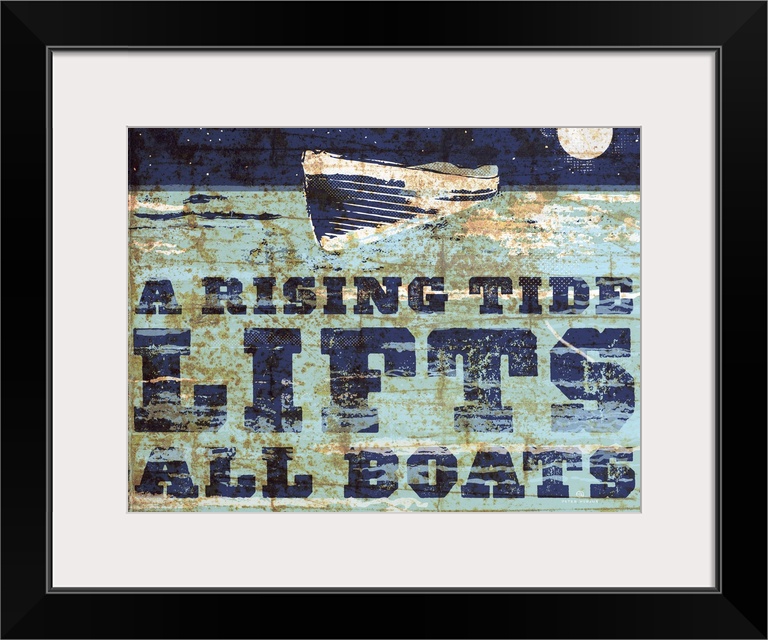 <p>A row boat floating at sea under a full moon with the words A Rising Tide Lifts All Boats.</p>