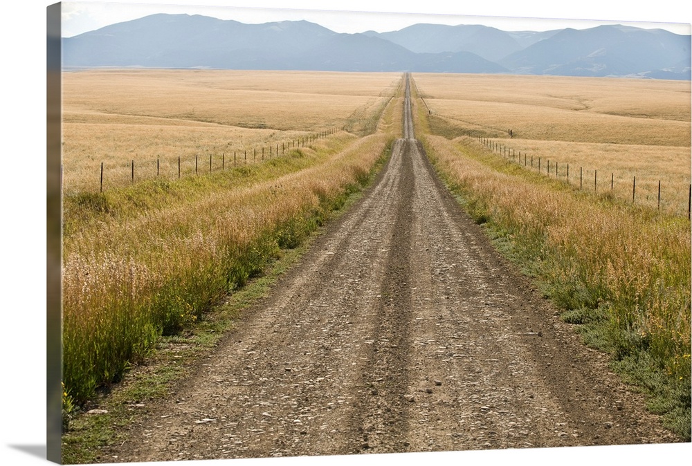 <p>A road cuts through a prairie in the Crazy Mountains.</p>