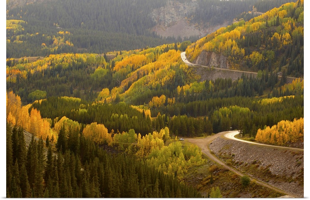 <p>A road meanders through the brilliant fall colors of the San Juan Mountains of Colorado</p>