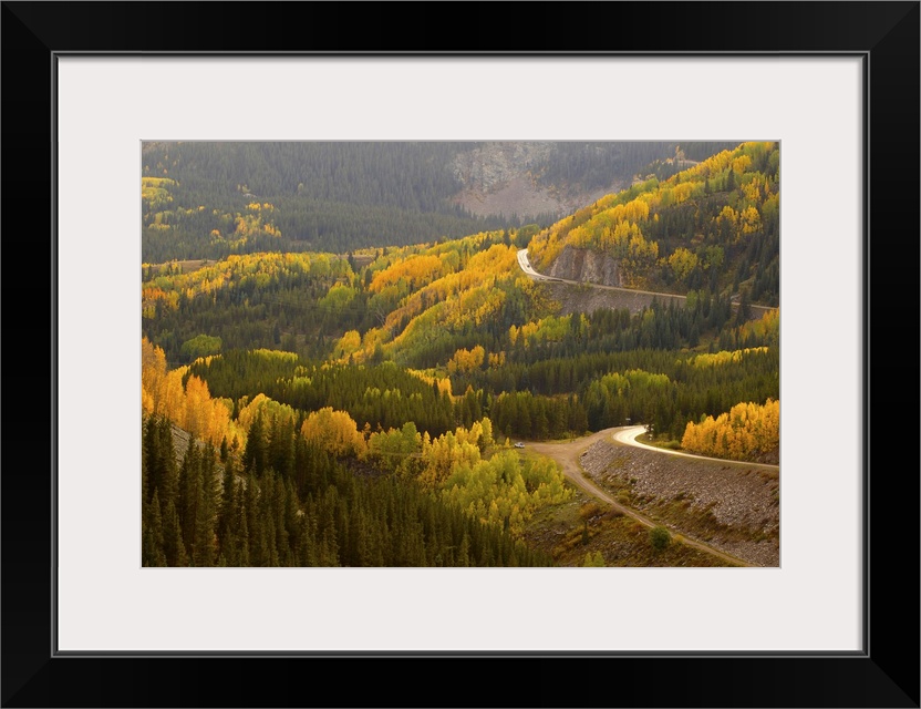<p>A road meanders through the brilliant fall colors of the San Juan Mountains of Colorado</p>
