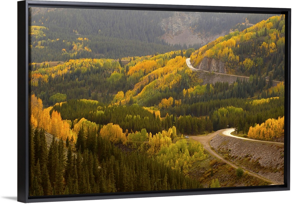 <p>A road meanders through the brilliant fall colors of the San Juan Mountains of Colorado</p>