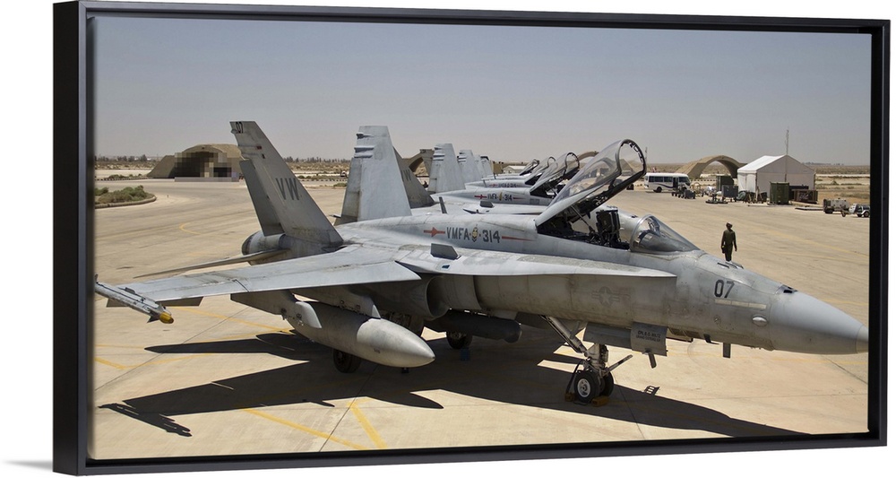 <p>A row of U.S. Marine Corps F-18 Hornets await post-flight maintenance during Exercise Eager Lion at an air base in northern Jordan.</p>