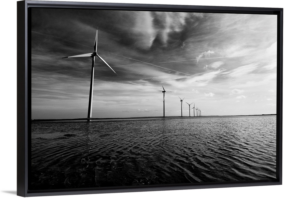 <p>A row of windmills in the sea, in the water with a dramatic sky and dramatic clouds overhead.Black and white image.</p>