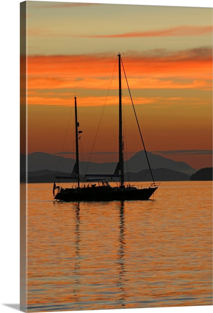 <p>Beautiful photograph of a sail boat sitting in the water with mountains in the background as the sun sets and lights up the sky with warm tones.</p>