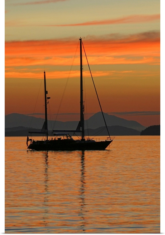 <p>Beautiful photograph of a sail boat sitting in the water with mountains in the background as the sun sets and lights up the sky with warm tones.</p>