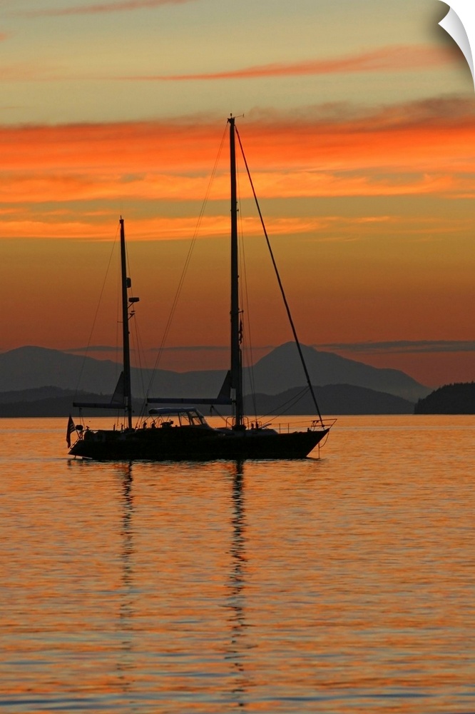<p>Beautiful photograph of a sail boat sitting in the water with mountains in the background as the sun sets and lights up the sky with warm tones.</p>
