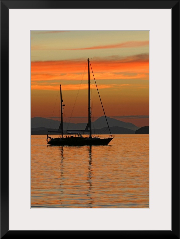 <p>Beautiful photograph of a sail boat sitting in the water with mountains in the background as the sun sets and lights up the sky with warm tones.</p>
