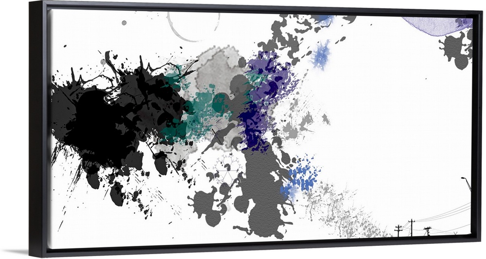 <p>Wide abstract painting of paint splatters, silhouettes of power lines, and street lights.</p>