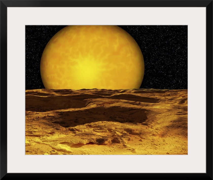 <p>A scene on a moon of Upsilon Andromeda b, a recently discovered extrasolar planet. It is a super-Jupiter that orbits very close to its star.</p>
