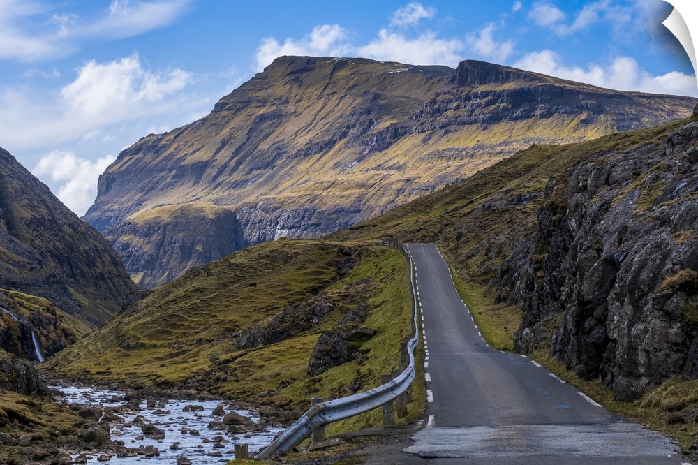 <p>A scenic empty straight uphill road leading to Saksun on the Faroe Islands.</p>