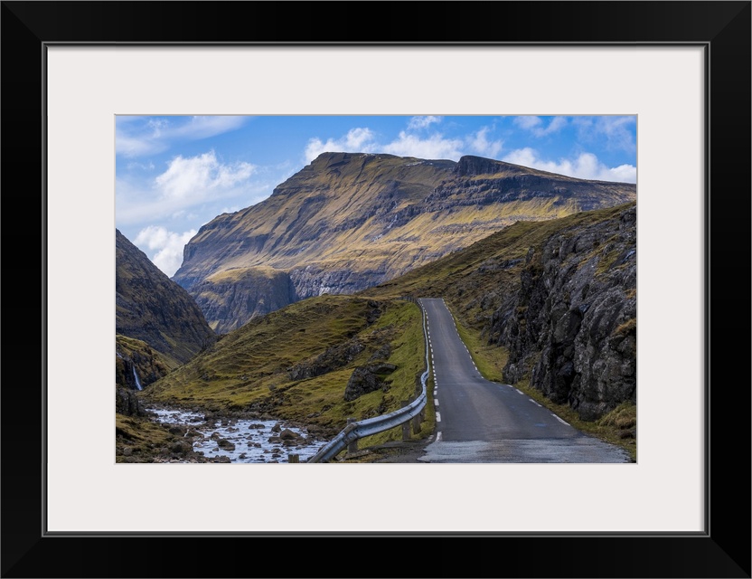 <p>A scenic empty straight uphill road leading to Saksun on the Faroe Islands.</p>