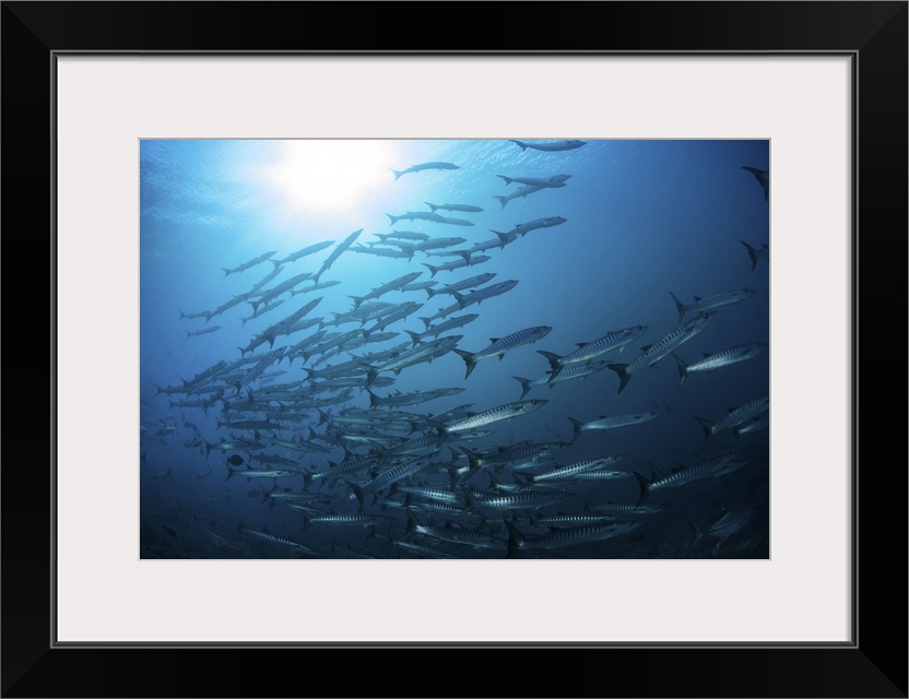 <p>A school of blackfin barracuda swimming in the blue waters of the Solomon Islands.</p>