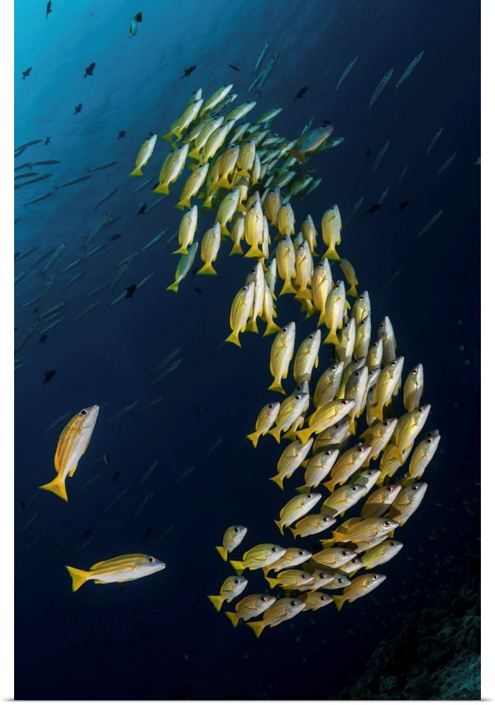 <p>A school of blue-striped snapper swimming in the strong currents of Palau.</p>
