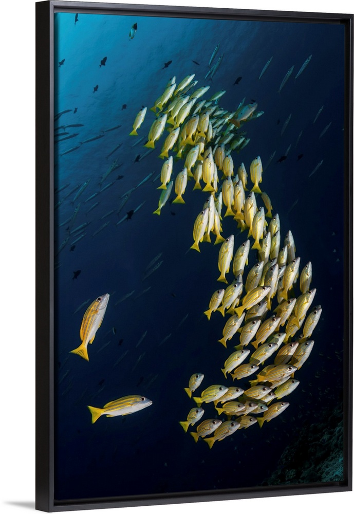 <p>A school of blue-striped snapper swimming in the strong currents of Palau.</p>