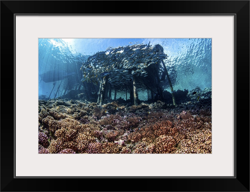 <p>A school of fish around a fisherman's jetty over a healthy coral reef, French Polynesia.</p>