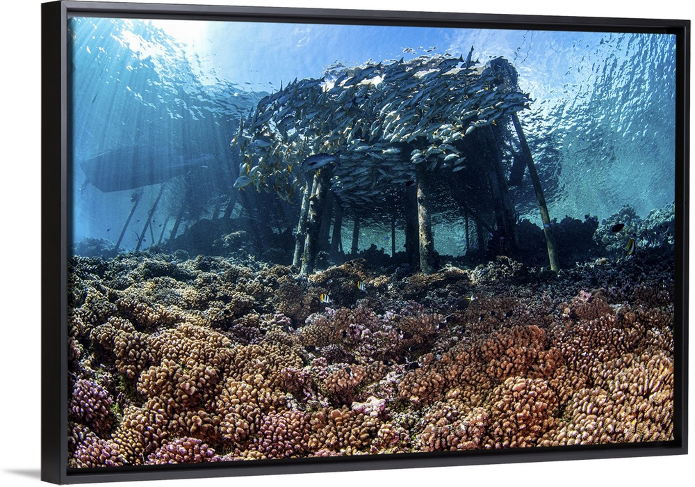 <p>A school of fish around a fisherman's jetty over a healthy coral reef, French Polynesia.</p>