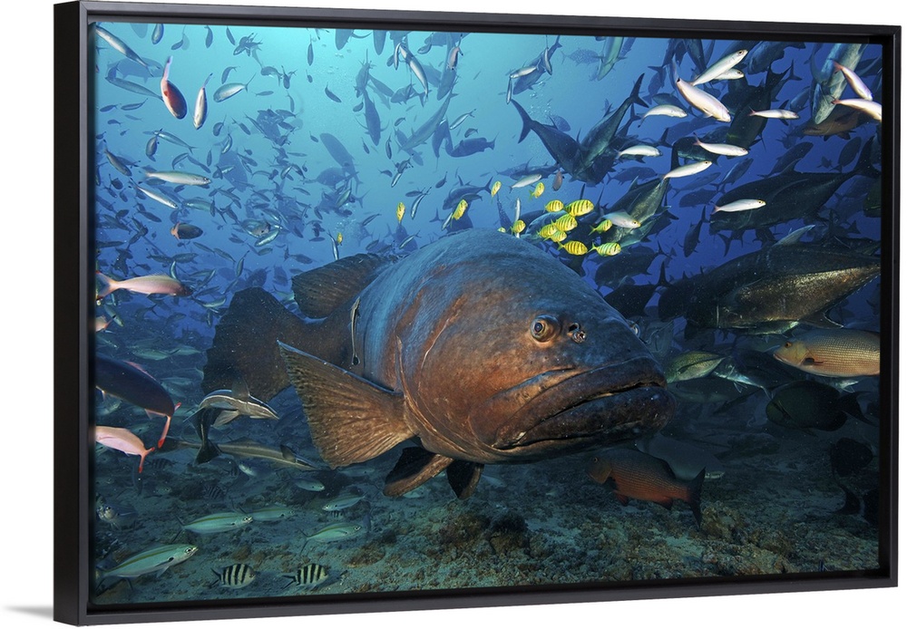 <p>Fiji - Giant grouper (Epinephelus lanceolatus) has a school of golden trevally (Gnathanodon speciosus) using its size for protection while hundreds of other fish swim about during a shark feed. The giant grouper is the largest bony fish in the world, and can grow up to 2.7m and 600kg.</p>