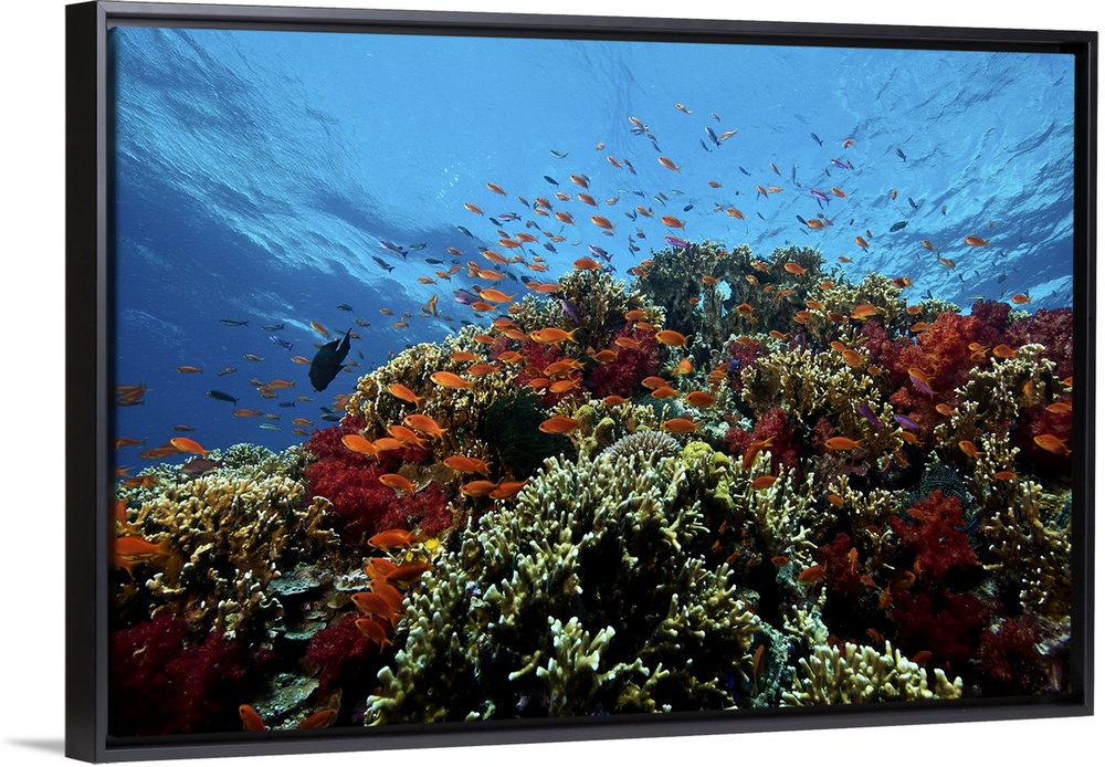 <p>A school of orange basslets (Pseudanthias squamipinnis) on a healthy coral reef, Fiji.</p>