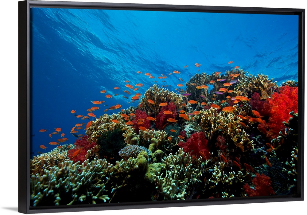 <p>A school of orange basslets (Pseudanthias squamipinnis) on a healthy coral reef, Fiji.</p>