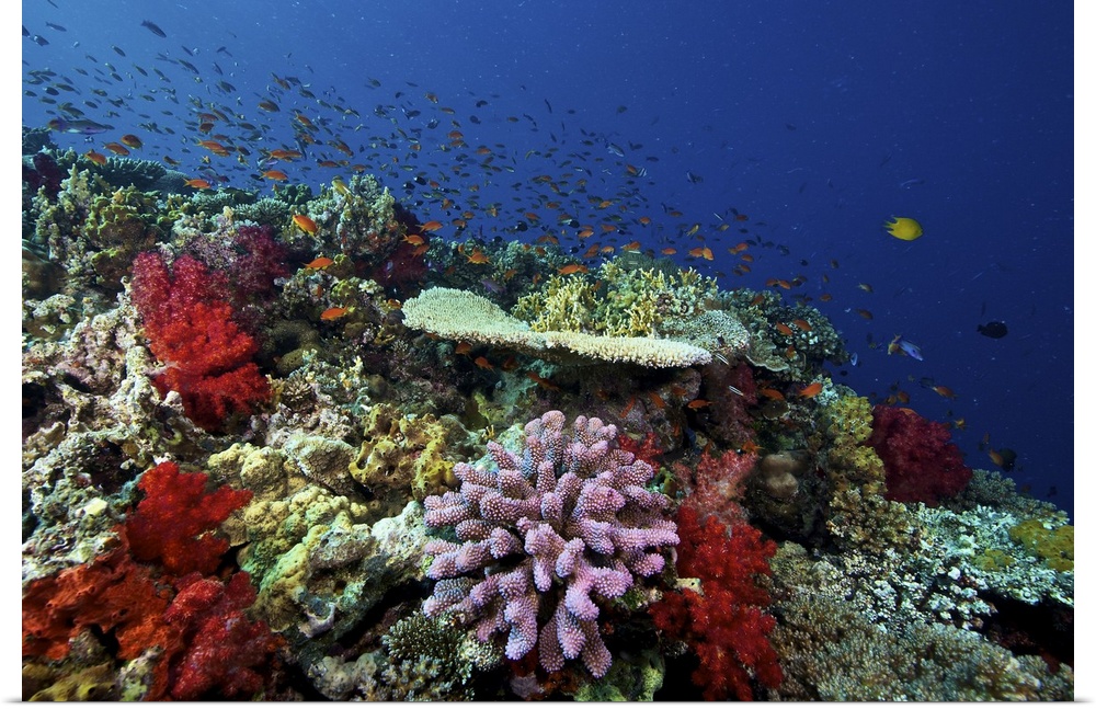 <p>A school of orange basslets (Pseudanthias squamipinnis) on a healthy Fijian reef full of hard and soft corals, Fiji.</p>