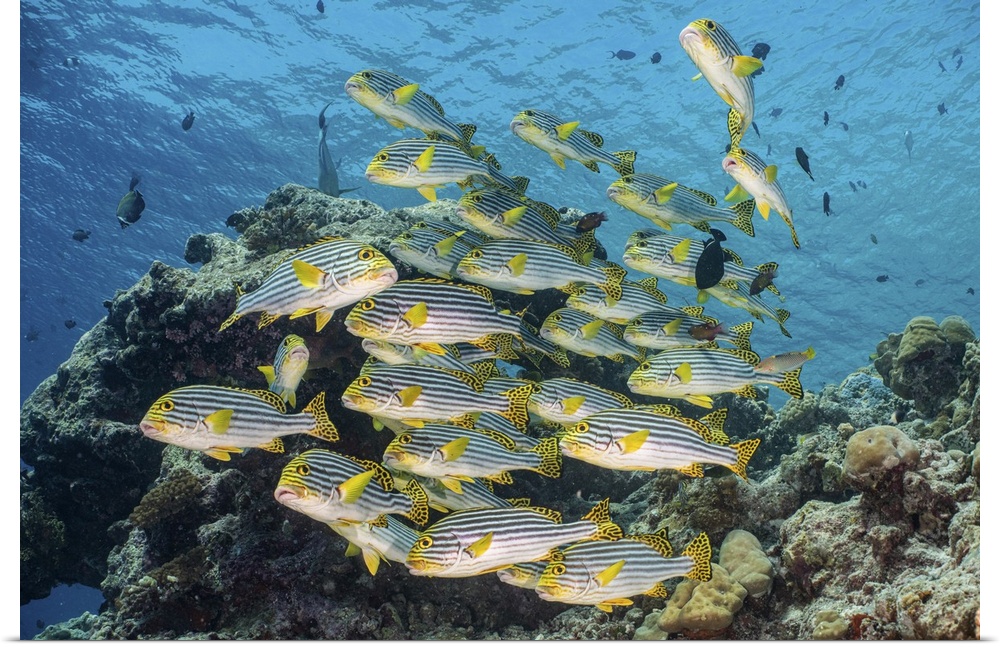 <p>A school of sweetlip fish stacked up against a coral head, Maldives.</p>