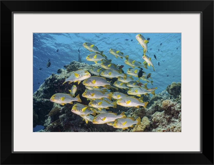 <p>A school of sweetlip fish stacked up against a coral head, Maldives.</p>