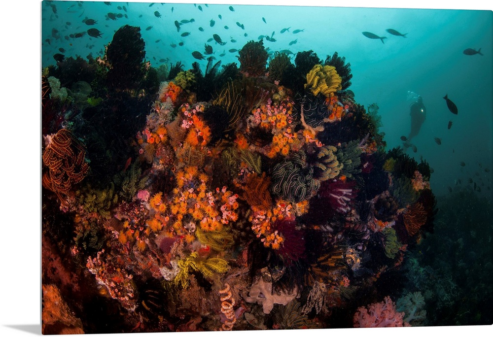 <p>A scuba diver explores a coral reef in Komodo National Park, Indonesia.</p>