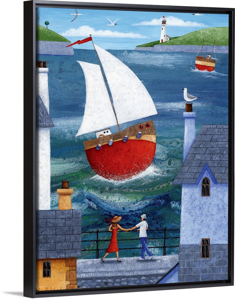 <p>Contemporary painting of a red sailboat sailing through a harbor town.</p>
