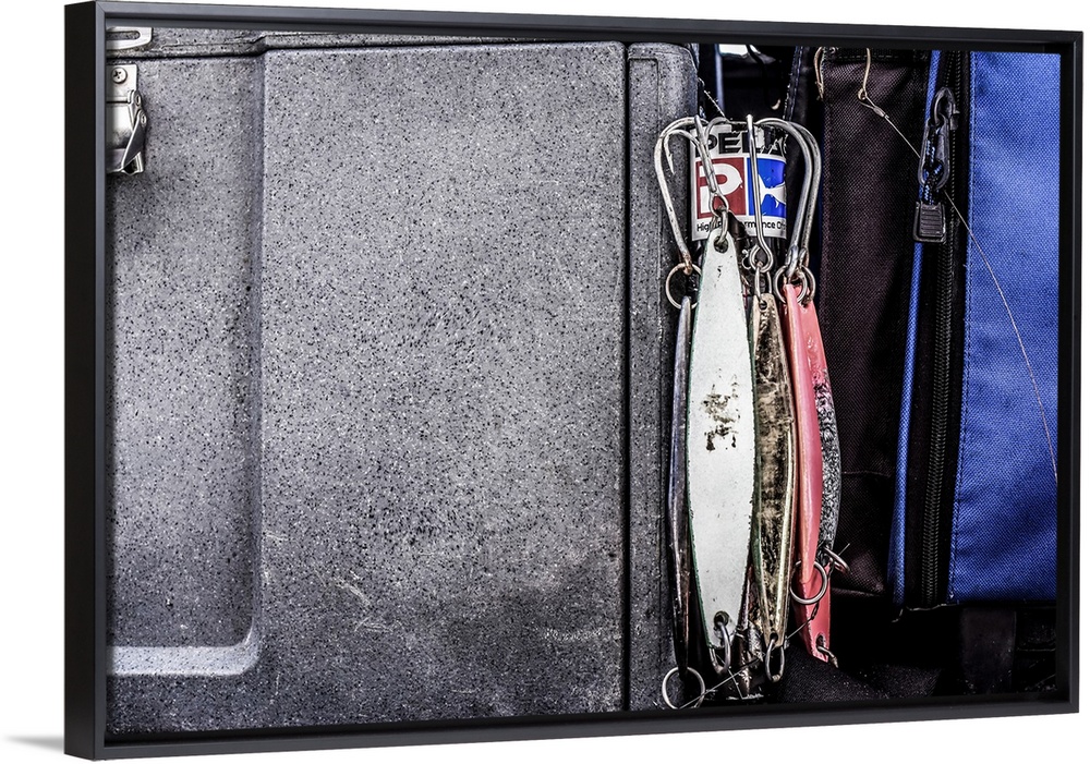<p>A set of fishing lures hang on a box waiting to be fished. Location: Excel Sportboat.</p>
