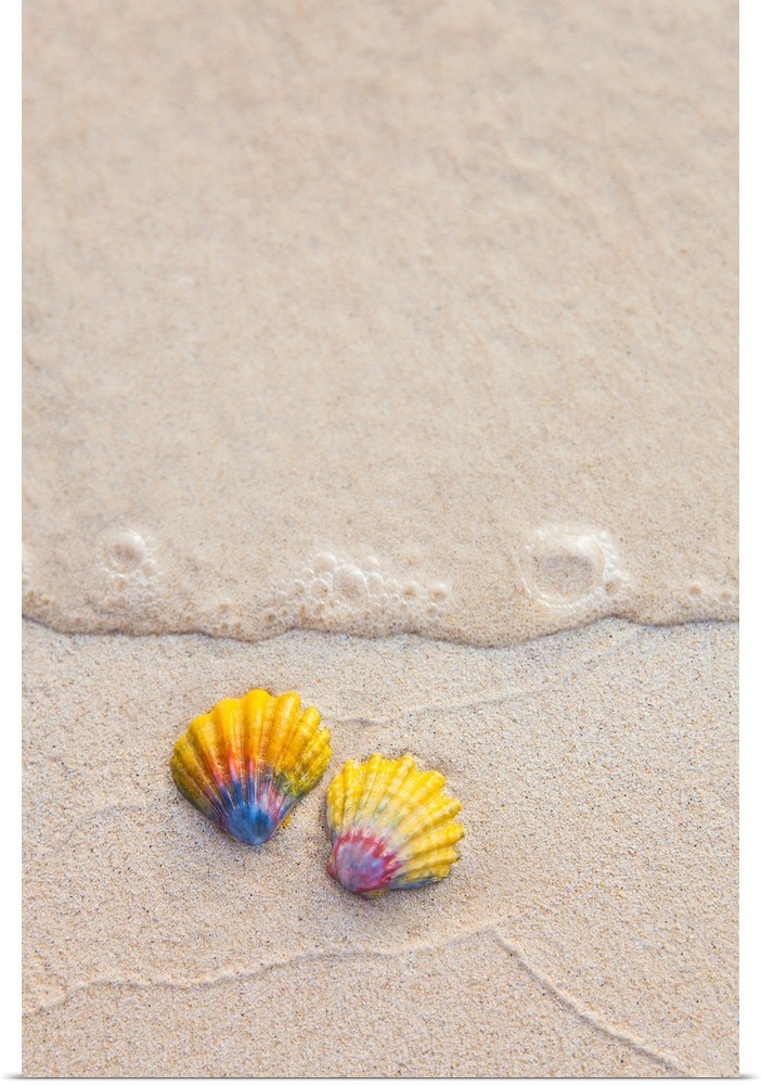 <p>A set of two rare Hawaiian Sunrise Scallop Seashells, also known as Pecten Langfordi, in the sand at Lanikai beach; Honolulu, Oahu, Hawaii, United States of America</p>