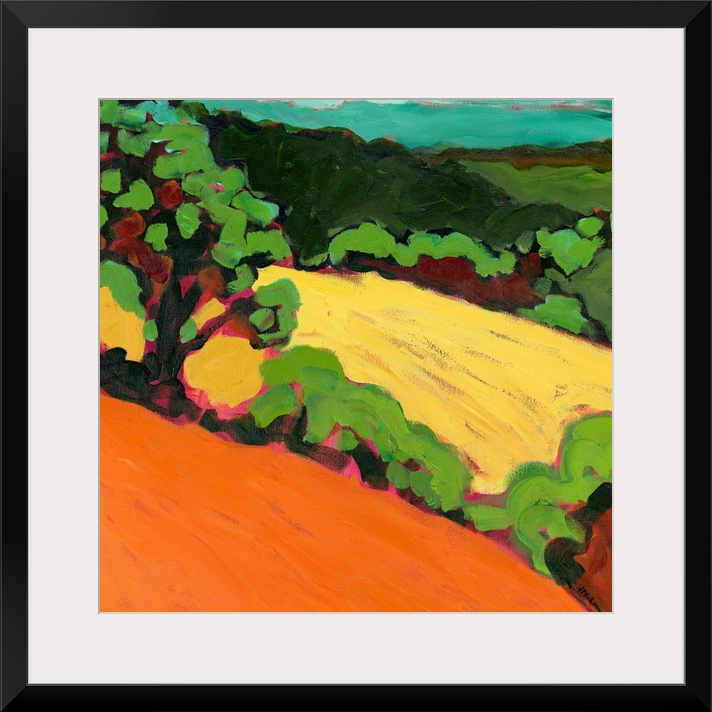 <p>Large contemporary art portrays the rolling hills of a country side sparingly filled with trees and bushes through the use of different warm tones.</p>