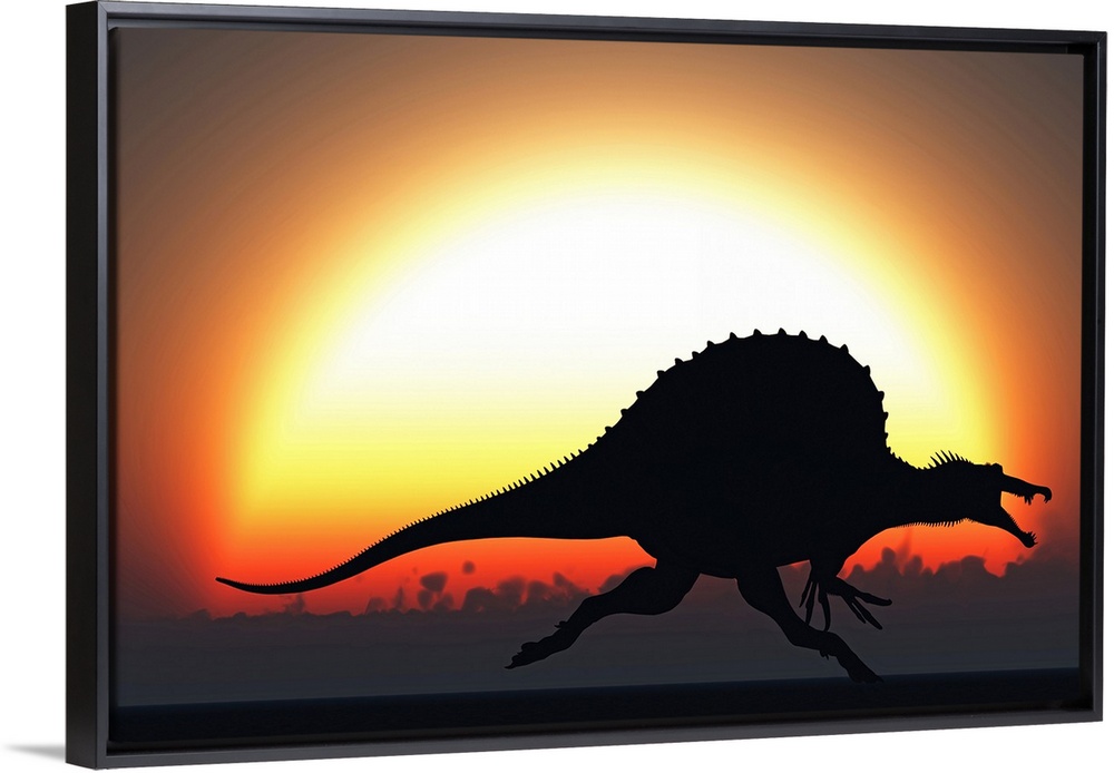 <p>A silhouetted Spinosaurus sprinting against a setting set at the end of another Jurassic day.</p>