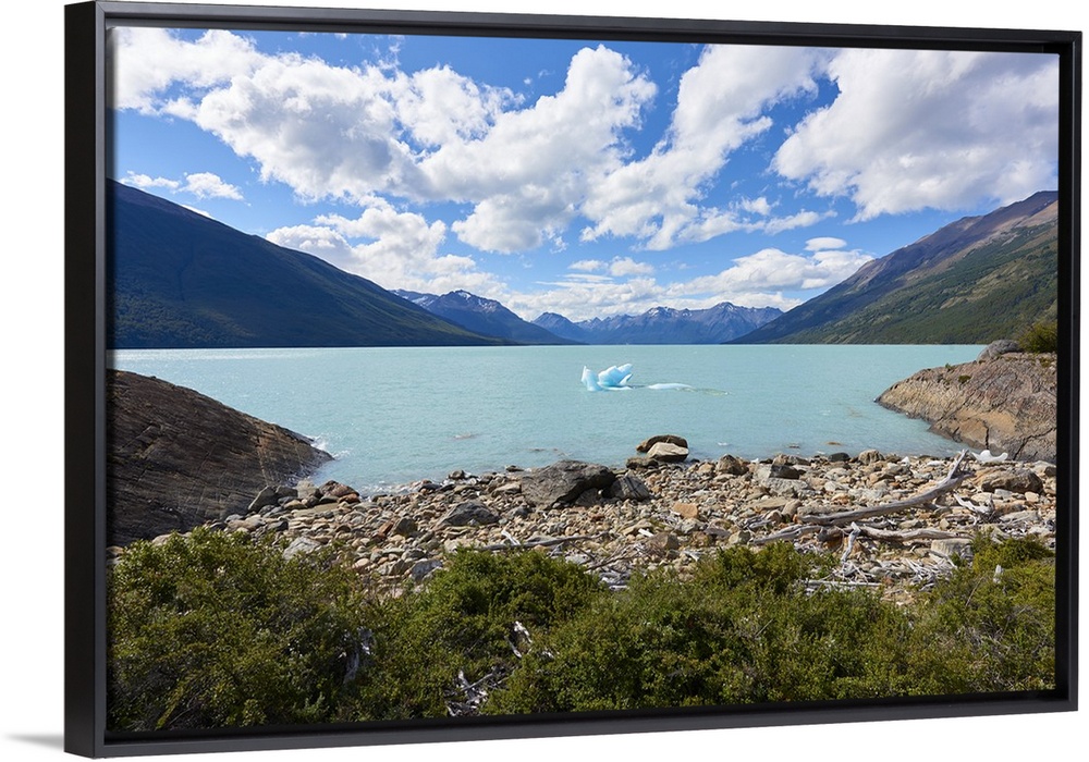 <p>A single iceberg floating near the shore in Lago Argentino near Perito Moreno Glacier, with mountains in the background, Los Glaciares National Park, UNESCO World Heritage Site, Patagonia, Argentina, South America</p>